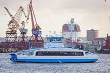 In 2015 two new ships were taken into traffic for Älvsnabbare, Älveli and Älvfrida, owned by Västtrafik, and in 2019 the electricity hybrid ferry Elvy. The ship has a capacity of 298 passengers and 80 bicycles in a saloon throughout the ship, so they can avoid turning around after disembarking. They have a maximum speed of 11 knots[11] which is also the maximum speed for ships on Göta älv.[12] They are both equipped with diesel-electrical machinery and with possibility to operate partly or wholly under electrical power after modification.