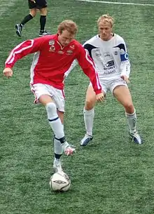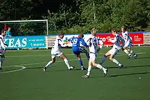 Ålgårds captain, Oddbjørn Sivertsen (white jersey), with an Askøy–player, in the match in 2. divisjon at Kleppestø 4 August 2007.