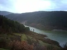 Çınarcık Dam is a rock-fill dam on the Orhaneli River about 30 km (19 mi) east of Mustafakemalpaşa in Bursa Province, Turkey. It serves several purposes to include power, irrigation, flood control and municipal water supply to the city of Bursa. The dam was constructed between 1996 and 2002.[1] Construction of the Uluabat Hydroelectric Station, which the dam supplies water to, began in 2006 and it was commissioned in 2010. The 125 m (410 ft) tall dam diverts water north through an 11.27 km (7.00 mi) long tunnel where it reaches the power station on the southern bank of Lake Uluabat. Water discharged from the 100 MW power station then enters the lake. The dam and power station are owned by the Turkish State Hydraulic Works.[2][3][4][5]