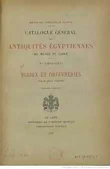 - Vernier, Émile; Service des Antiquités de l'Egypte (1927). Catalogue général des Antiquités égyptiennes du Musée du Caire. Vol. II, Index et planches: Bijoux et orfèvreries. Cairo: Institut français d'archéologie orientale.