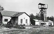 The definitive metal headframe was built in June 1950. It was fitted with the wheels and the winding engine (electric hoist) from the Sainte-Marie coal mine. Two buildings surrounded the shaft: the winch building and the building housing the two air compressors (one of which came from the Chanois coal mine, which was at the end of its working life). Another building to the north, near several gallery entrances, housed the changing rooms, showers and blacksmith's workshop. In November 1955, the Chanois shaft's muffler valve was added, along with a cage depth indicator.[6][7]