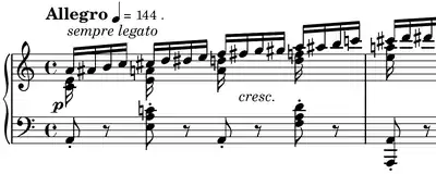 Musicologist Hugo Leichtentritt (1874–1951) calls the étude a "moto perpetuo".[10] The transparent texture of nonstop semiquavers accompanied by a light "dancing" bass has its forerunners in Bach's Prelude No. 5 in D major (BWV 850) from the first book of The Well-Tempered Clavier and resembles other virtuoso pieces from around 1830 such as Paganini's Moto Perpetuo for violin and piano. In Robert Schumann's substantial 1836 Neue Zeitschrift für Musik article on piano études,[11] all Chopin Études Op. 10 are awarded an asterisk (*) for "poetic character" except No. 2. But Leichtentritt describes its sound effect as the "murmuring and blowing of a gentle wind",[10] French pianist Alfred Cortot (1877–1962) mentions its "gliding and vaporous character"[12] and Alfredo Casella talks about a "character of swift, aerial and unsubstantial mysteriousness".[13] The American music critic James Huneker (1857–1921) writes that "the entire composition, with its murmuring, meandering, chromatic character, is a forerunner to the whispering, weaving, moonlit effects in some of [Chopin's] later studies".[9]