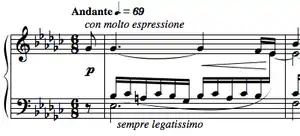 American music critic James Huneker (1857–1921) calls the étude "a dark doleful nocturne. […] the melody is full of stifled sorrow."[13] Italian composer and editor Alfredo Casella (1883–1947) speaks of "meditated grief" and thinks "it is difficult to conceive an elegy more severe and sober than this study."[14] French pianist Alfred Cortot (1877–1962) on the other hand calls the character of this study "feverish and concentrated" and insists that "below the passionate lament of the upper voice […] we must hear a vital lower part […] uniting with it [yet] preserving its own timbre and its own freedom of rhythm."[15]