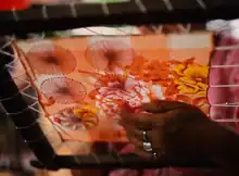 The lace is worked on fabric which is stretched tightly in a frame. The pattern is drawn on the fabric and the threads, which go to-and-fro across the circular motif and are either taken through running stitches worked along the pattern lines or stitched directly through the fabric. When finished, the motifs are released by either cutting the running stitches or cutting away the backing fabric. While single motifs can be worked like this, it is more usual to work the whole item as one piece - the pattern for the complete mat or collar is drawn on the fabric and the wheels are linked together as the radial threads are laid down.[2]