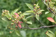 × Sorbaronia mitschurinii, also known as Sorbaronia mitschurinii, is a domesticated species that was known until recently under the name Aronia mitschurinii.[2] It has been considered to be a group of cultivars of Aronia melanocarpa, common ones including 'Viking' and 'Nero'. Genetic testing indicates it is likely a hybrid between A. melanocarpa and Sorbus aucuparia (mountain ash)[3] that apparently originated in cultivation.[2][4]