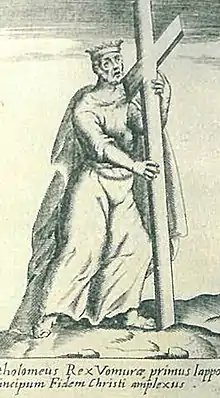 Ōmura Sumitada (大村 純忠, 1533 – June 23, 1587) was a Japanese daimyō lord of the Sengoku period. He became famous throughout the country for being the first of the daimyo to convert to Christianity following the arrival of the Jesuit missionaries in the mid-16th century. Following his baptism, he became known as "Dom Bartolomeu". Sumitada is also known as the lord who opened the port of Nagasaki to foreign trade.