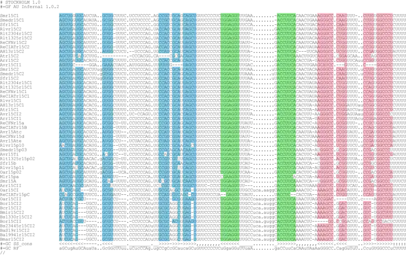 Both S.melilloti αr15 sRNAs were also BLASTed with default parameters against all the currently available bacterial genomes (1,615 sequences at 20 April 2011; https://www.ncbi.nlm.nih.gov). The regions exhibiting significant homology to the query sequence (78-89% similarity) were extracted to create a Covariance Model (CM) from a seed alignment using Infernal (version1.0)[5] (Figure 2). This CM was used in a further search for new members of the αr15 family in the existing bacterial genomic databases.