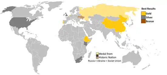 Ethiopia is the most successful nation in the event, with ten gold medals among its total of 24. Finland is the next most successful, with six gold medals and thirteen overall. Finland's period of great success in early 20th century led to wide usage of the nickname the Flying Finns; Kaarlo Maaninka was the last Finnish athlete to medal over 10,000 m, in 1980. Kenya has won eleven medals, although Naftali Temu is the only Kenyan to have won Olympic gold.