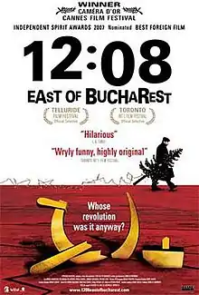 12:08 East of Bucharest (Romanian: A fost sau n-a fost?; lit. 'Was it or was it not?') is a 2006 Romanian film directed by Corneliu Porumboiu, released in 2006 and winner of the Caméra d'Or Prize (for best first film) at the Cannes Film Festival.[3] It was also released in the United States under the abridged titles East of Bucharest and 12:08 Bucharest. The film is set in a small Moldovan town far away from the capital city of Bucharest, and centers on a group of characters who revisit the Romanian Revolution of 1989 which brought an end to the communist regime.