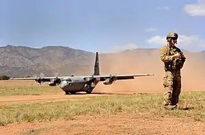 ![]() A 125th Special Tactics Squadron special operations weatherman takes weather readings while a C-130 lands at the Red Devil air strip at Fort Carson, Colorado | |