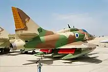 147 Squadron was reactivated once again at Hatzerim on August 6, 1978, commanded by Hanoch Patishi.[2][11] Operating a mix of A-4Es, A-4Fs and A-4Ns, it was the IAF's eighth and last A-4 Skyhawk squadron. Initially conceived as a unit manned by reservists with a skeleton crew of air force regulars, this arrangement was soon found unsatisfactory by both groups and the squadron reverted to the usual IAF combination of regulars, emergency postings and reserves.[1] It adopted an emblem depicting a ram with wings against a yellow background, an all-yellow rudder and yellow-tipped external fuel tanks.[11][12]