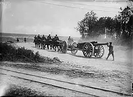 Artillery policy in the BEF was to withdraw heavy batteries from the divisions and group them into dedicated heavy artillery formations, so 14th Hvy Bty left 14th (Light) Division on 8 June and two days later (together with 1/1st Warwickshire and 9th Hvy Btys) it became part of the recently-arrived 16th Heavy Artillery Brigade, RGA.[2][6][10][11][12][13]