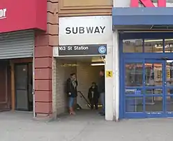Despite the station's name, there is no longer an open exit to 163rd Street. The closed northern half had three exits leading to 163rd Street.[19][20] By the late 1980s, the exits were closed and eventually sealed. Two of the exits went to the southwest corner,[21] while the third exit, which was temporarily uncovered as an area to haul out debris from renovations, went to the southeast corner.[22]