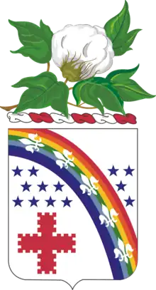 The five fleurs-de-lis on the unit's coat of arms symbolize the five major operations it participated in during World War I. Its engagement at La Croix Rouge Farm is represented by the embattled red cross. The coat of arms was approved in 1923. In 1971, thirteen stars were added to symbolize the battles the unit fought during the Civil War. The insignia was approved that same year.[4]