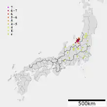 The 1828 Sanjō earthquake (Japanese: 三条地震) occurred on December 18, 1828 at Sanjo, Niigata Prefecture (then Echigo Province) in Japan.[1] According to the official report, 21,134 houses and buildings were damaged, and 1,204 of them burned down.[2] There were around 1,450 casualties.[3]