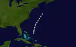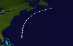 The first known tropical cyclone of the season was observed on September 3, about halfway between the Bahamas and Bermuda.[1] A nearby ship estimated winds of 80 mph (130 km), indicating the presence of the hurricane.[4] It moved northward initially, passing about 220 mi (350 km) west of Bermuda on September 4. Thereafter, the hurricane turned toward the northeast,[1] and the ship "John Richardson" encountered gale force winds on September 5, resulting in a wreck of its cargo.[2] On September 6, it was estimated to have reached peak winds of 105 mph (169 km/h), based on observations from the ship with the call sign "Greenock".[4] The hurricane lashed the ship with strong winds for 14 hours, killing the captain and one crewman. At the time, it was about 400 mi (640 km) southeast of Halifax, Nova Scotia.[2] Turning to the northeast, the hurricane passed south of Newfoundland before last being observed on September 7.[1]