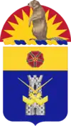 That for the regiments and separate battalions of the Oregon Army National Guard: On a wreath of the colors Or and Azure, a demi-disc Gules charged with the setting sun with twelve light rays Or (the shoulder sleeve insignia of the 41st Division), behind a beaver sejant Proper. Motto "Custodes Portae Occidents" (Guardians of the Western Gates)