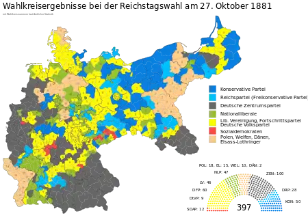 Federal elections were held in Germany on 27 October 1881.[1] The Centre Party became the largest party in the Reichstag, with 100 of the 397 seats, whilst the National Liberal Party, which had previously been the largest party, was reduced to 45 seats.[2] Voter turnout was 56.3%.[3]