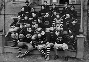 On November 28, 1895, VAMC played their final game of the season against the Virginia Military Institute in Lynchburg, Virginia in front 3,000 spectators.[11] VMI was the first team to put points on the board, when their halfback Dickinson scored a rushing touchdown at the end of the first half.[11] However, VAMC's Miles Hart was able to rush into the end zone for a touchdown and R. N. Watts kicked the extra point to win the game, 6–4.[10][11]