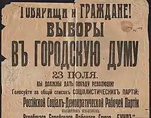 Ahead of the election the Ukrainian socialist parties had decided to launch a list of their own, in protest of what they saw as the 'anti-Ukrainian campaign' in the Russian socialist press.[4] On the other extreme stood the Bloc of Russian Voters, one of the Russian nationalist groups that had emerged in response to the formation of the Central Rada in March 1917.[5][6] Their main electoral slogan was 'Down with Ukraine and Ukrainization'.[6]
