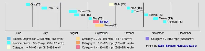 | Six | September 6–13 | Category 4 hurricane | 130 (215) | 952 | Honduras, Belize, Mexico | $7.5 million[2] | 2,500[6] | |||