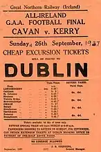 The Radio Athlone commentator mistakenly announced Cavan as the winners of the first game; Packie Boylan's late point had been disallowed. Kerry won the replay by six points, with goals by Timmy O'Leary (2), Miko Doyle and John Joe Landers.[1]