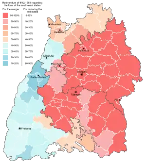A referendum was held on 9 December 1951 in the states of South Baden, Württemberg-Baden, and Württemberg-Hohenzollern. Voters were asked whether they favoured a merger of the three states into a single state or the re-establishment of the old states of Baden and Württemberg. 69.7% of voters favoured unification with a turnout of 59.2%.