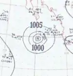 Ships reports from the Hawaiian Islands to Panama indicated that an area of disturbed weather formed just west of the Revillagigedo island group. Initially, evidence of closed wind circulation was not sufficient enough to warrant an upgrade into a tropical disturbance. By the afternoon, pressures in the region began to fall. By that night, it was estimated to have developed winds of 40 mph (65 km/h).[3] A tropical storm formed on September 9;[6] meanwhile, ship reports indicated a pressure of 1,001 mbar (29.6 inHg) and sustained winds of 50 mph (85 km/h).[3] Maintaining peak intensity for a day, the low moved northwest before dissipating on September 10 as[6] barometric pressures began to rise. The remnants of the storm later brought rain to Central California on September 15.[3]