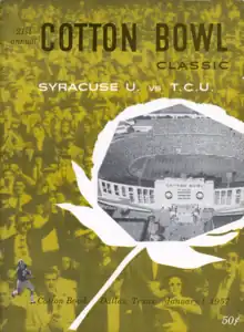 The 1957 Cotton Bowl Classic was the 21st edition of the college football bowl game, played at the Cotton Bowl in Dallas, Texas, on Tuesday, January 1. Part of the 1956–57 bowl game season, it matched the independent and eighth-ranked Syracuse Orangemen and #14 TCU Horned Frogs of the Southwest Conference (SWC).[2] Favored TCU held on to win by a point, 28–27.[3]