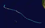 Upon transferring responsibility, the hurricane was given the name Kanoa, the Hawaiian name meaning "the free one".[1][2] As the storm approached Hawaii, it began to weaken as convection filled the eye. The storm's track mirrored that of the shipping lane between the Panama Canal and Hawaii, leading to several ships being affected.[1] Colder air also began to enter the circulation, leading to further weakening. By the time the system reached Hawaii, it was no more than an area of disturbed weather. The remnants of Kanoa persisted until July 26, at which time they dissipated over the Hawaiian Islands.[3] The remnants of the storm brought beneficial rainfall to most of Hawaii, with heavy rains being reported in parts of the Big Island.[1]