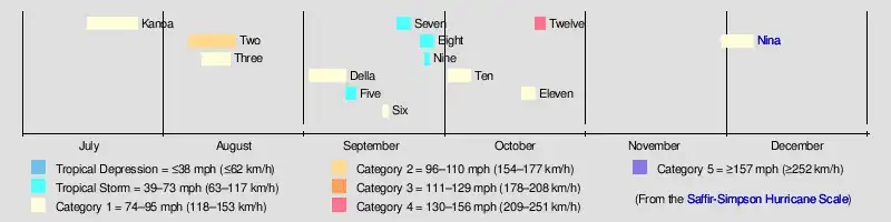 During 1957, hurricanes that formed east of 140°W were not given names by the local warning center.[16] Those that either crossed or formed west of that point were named by the National Weather Bureau in Honolulu, Hawaii. These names were taken from the names used for Pacific typhoons. Three names were used in 1957, they were Kanoa, Della and Nina. Due to the lack of major damage from these storms, their names were not retired.[1][2] However, once the Central Pacific adopted its own naming scheme, these names were no longer used.[16]