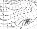 Although at an unusual latitude, the storm maintained this intensity for over a day before weakening to a tropical storm.[2] During the afternoon of August 13, the small system re-intensified into a hurricane. Reconnaissance reported that gale-force winds extended no more than 100 mi (160 km) from the storm's eye.[3] Shortly thereafter, the system further intensified into a Category 2 hurricane, attaining maximum winds of 105 mph (170 km/h).[2] Weather maps at the time depicted the storm as having a minimum pressure of 987 mbar (hPa).[3] By August 14, the storm began to weaken once more, gradually becoming a tropical storm on August 15. After turning northward, the cyclone became extratropical at a high latitude of 39.8°N.[2][3]