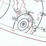 Hurricane Della was first identified on September 1 southeast of Hawaii as a tropical depression. The depression quickly intensified into a tropical storm as it traveled northwest;[2] however, operational advisories were not issued until September 3. By that time, a ship reported they had encountered a storm and recorded winds of 100 mph (160 km/h). Radar images also depicted an eye had developed within the storm.[1] After becoming a hurricane, Della began a gradual turn towards the southwest.[2] During the day on September 4, the storm passed roughly 10 mi (15 km) south of the French Frigate Shoals, bringing strong winds gusting up to 110 mph (175 km/h). During the storm's passage, a pressure of 980 mbar (hPa) was recorded, the lowest in relation to the storm.[1] By September 9, Della began to turn westward as it approached the International Date Line with winds of 85 mph (135 km/h).[2]
