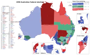 - ↑ The Northern Territory and Australian Capital Territory each had one seat, but members for the territories did not have full voting rights until 1966 and did not count toward government formation.