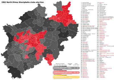 The CDU lost its majority with a decline of four percentage points to 46%, but remained the largest party by a small margin. The opposition Social Democratic Party (SPD) saw a corresponding gain of four points and won 43%. The Free Democratic Party (FDP) remained steady on 7%. The CDU subsequently formed a coalition with the FDP, and Franz Meyers continued as Minister-President.