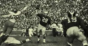 ![]() Michigan quarterback Wally Gabler (No. 29) and halfback Carl Ward (No. 19) | |