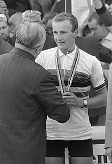 Evert Dolman receiving his winner prize for Amateurs' road race.