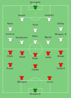 Rangers started the slower of the two sides, with Albion passing the ball with some considerable pace. Any QPR attack stagnated once someone attempted to pass the ball through to Rodney Marsh or Les Allen, who were overwhelmed by the numbers of Albion defensive players. Albion's first goal came in the seventh minute as the ball was worked down the left hand side of the pitch by Tony Brown, Bobby Hope and finally Doug Fraser, before Clive Clark's shot went through a gap in QPR's defence. The Albion supporters began provocatively chanting "easy", although QPR were immediately on the attack with Albion goalkeeper Dick Sheppard saving a shot from Frank Sibley.[19]