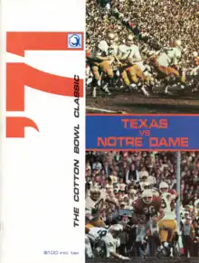 The 1971 Cotton Bowl Classic was the 35th edition of the college football bowl game, played at the Cotton Bowl in Dallas, Texas, on Friday, January 1.[3] A rematch from the previous year, the undefeated and top-ranked Texas Longhorns of the Southwest Conference were upset by the independent Notre Dame Fighting Irish, 24–11.[2][4][5]