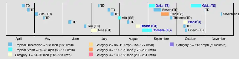 The season officially began on June 1, 1973, and lasted until November 30, 1973. These dates conventionally delimit the period of each year when most tropical cyclones form in the Atlantic basin.[3] However, the first system formed on April 18, more than a month before the official start. Three more depressions formed before June 1; however, none attained storm intensity. The first named storm of the year was Hurricane Alice which formed on July 1 and became the first known cyclone to affect Bermuda during July. More than a month later, the second hurricane, Brenda, formed and was considered the worst storm to strike Mexico along the eastern coast of the Bay of Campeche, killing 10 people.