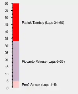 Brabham driver Riccardo Patrese had taken the lead from Tambay with six laps remaining, but only held the lead for half a lap before crashing at Acque Minerali. He later described the accident as "purely my mistake". Showing their love for Ferrari more than for an Italian driver in a non-Italian car, the Tifosi cheered as Patrese handed the lead back to Tambay.[1]