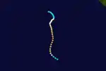 While Honorinina was intensifying and moving toward Madagascar, another system was forming on March 13 south-southeast of Diego Garcia.[31] At 06:00 UTC that day, a tropical storm formed,[32] although it was not named Iarima until the next day.[31] Also on March 13, the JTWC began classifying the storm as Tropical Cyclone 26S.[2] Iarima initially moved southwestward, failing to intensify beyond winds of 65 km/h (40 mph).[32] On March 15, the storm turned and accelerated to the southeast after an anticyclone formed between Iarima and Honorinina. It subsequently weakened, dissipating on March 18 while approaching 90° E.[31][32]