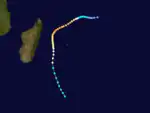 The monsoon was active in early January across the Indian Ocean, spawning what would eventually become Tropical Cyclone Delifina.[5] On January 7, the JTWC classified the system as Tropical Cyclone 04S to the east-southeast Tropical Storm Costa.[2] However, the MFR did not classify it initially due to lack of data. The system had a curved area of convection, and organized enough for MFR to designate it Tropical Storm Delifina on January 10.[14] On the same day, the JTWC upgraded the storm to the equivalent of a minimal hurricane.[15] The storm moved generally southward, after an initial westward movement. Delifina gradually intensified, becoming a tropical cyclone on January 13. By that time, the storm had an eye in the center of deep organized convection. The MFR estimated peak winds of 135 km/h (85 mph), while the JTWC estimated 1 minute winds of 205 km/h (125 mph). Subsequently, Delifina weakened as it progressed southward. After turning to the southeast, the deteriorating storm turned sharply northwestward between two ridges. Delifina turned back to the east and dissipated on January 19 at nearly the same longitude where it formed.[14][15]