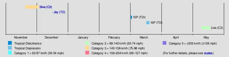 The basin then remained quiet until March when three significant tropical depressions including 15 and 16P were observed within the Coral Sea/Australian region, which did not develop into tropical cyclones but were subject to gale warnings.[6] 15P was first noted on March 3, while it was located about 900 km (560 mi) to the east of the Solomon Islands and over the next couple of days subsequently moved south-westwards and out of the South Pacific basin during the next day.[7] 16P was first noted on March 14, while located about 300 km (185 mi) to the southeast of Honiara in the Solomon Islands.[8][A 1] Over the next couple of days the system moved towards the south-east before the JTWC designated the system 16P and initiated advisories on it during March 18, after it had moved into the South Pacific basin.[9] Over the next couple of days the system, moved towards the south-southeast, before it turned towards the southwest and passed over New Caledonia on March 20, before it was last noted during the next day moving out of the basin.[8] The final tropical cyclone of the season, Lisa, moved into the Southern Pacific on May 11 at its peak intensity of 110 km/h (75 mph).[1][10] During the next day as the storm moved towards the subtropical jet, Lisa rapidly weakened into a tropical depression before passing over Anatom Island without causing any significant damage.[1] After the season both the names Sina and Joy were retired from the naming lists for the region, while it was determined that a weak gale force tropical cyclone had affected Tonga between December 14–17.[2][11][12]