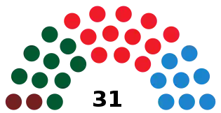 Last election 13 seats, 38.7% 7 seats, 20.9% 8 seats, 25.5%[lower-alpha 1]