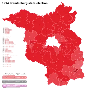 The 1994 Brandenburg state election was held on 11 September 1994 to elect the members of the 2nd Landtag of Brandenburg. The incumbent government was a traffic light coalition of the Social Democratic Party (SPD), Free Democratic Party (FDP) and The Greens, led by Minister-President Manfred Stolpe. The SPD achieved a 16% swing in its favour and won an absolute majority with 54% of the vote, while both of its coalition partners lost their seats. The Christian Democratic Union (CDU) suffered a major swing against it, falling to 18.7%. The Party of Democratic Socialism (PDS) also finished on 18.7%, just 62 votes behind the CDU. Minister-President Stolpe continued in office.
