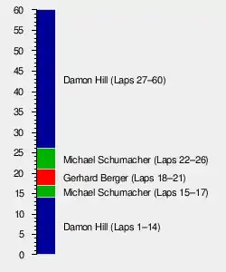 On lap 14, Michael Schumacher was handed a five-second stop-go penalty for overtaking Hill on the first formation lap. He failed to serve the penalty by lap 21, and as a result was shown the black flag, requiring him to stop immediately at the pits. Schumacher did not acknowledge the black flag and was shown it again on both of the next two laps, he later claimed that he had not seen it. Benetton told the race officials that there had been a misunderstanding over the 5-second stop-go penalty, and after discussing the issue with the team the officials withdrew the black flag and Schumacher finally served the stop-go penalty at the end of lap 27.[1][2]