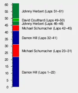 Schumacher slowly began to reduce Hill's lead, which had grown to 19.5 seconds.[29] Salo made a pit stop on lap 19, dropping behind Papis and the Minardi drivers, but gained a position on Boullion when the Sauber driver stopped on the next lap.[1] By this stage Häkkinen and Berger had risen to fourth and fifth respectively, but both retired on lap 21: Häkkinen's McLaren suffering a progressive electronic problem which caused its hydraulic system to fail; Berger pulling off the track shortly after making his first pit stop due to an incorrectly fitted left-front wheel.[36] The remaining two-stoppers made pit stops on laps 21 and 22: Herbert came in from third place and retained his position by rejoining ahead of Alesi and Coulthard; Blundell dropped from fourth to seventh, Gachot retained 16th; and Barrichello and Panis made their first scheduled stops, the Jordan dropping from seventh to eighth and the Ligier rejoining in 11th from ninth.[1] At the head of the field, Hill came in on lap 22, rejoining nine seconds behind Schumacher, who now led the race.[36] Two further retirements also occurred during this stage of the race: Montermini spun out of 17th place on lap 22, whilst Katayama, who was due in for a pit stop of his own, retired from eighth position when his engine cut due to fuel starvation on the following lap.[1][14] At the end of lap 23, the running order was Schumacher, Hill, Herbert, Alesi, Coulthard, Frentzen, Blundell, Barrichello, Martini, Papis, Panis, Badoer, Salo, Boullion, Gachot and Moreno.[1]