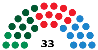 Last election 8 seats, 24.4% 12 seats, 38.6% 9 seats, 27.6%