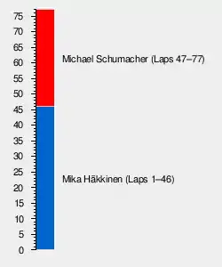 The 77-lap race was won by German driver Michael Schumacher, driving a Ferrari, after he started from third position. Drivers' Championship leader, Finn Mika Häkkinen, took pole position in his McLaren-Mercedes and led the first 46 laps. Under guidance from Ferrari technical director Ross Brawn, Schumacher opted to take three pit stops rather than the two favoured by the McLarens, and took the lead after his second stop, before extending his advantage such that he could retain it after his third stop.[2] Schumacher went on to win by 9.4 seconds from Briton David Coulthard in the other McLaren-Mercedes, with Canadian Jacques Villeneuve third in a Williams-Mecachrome.